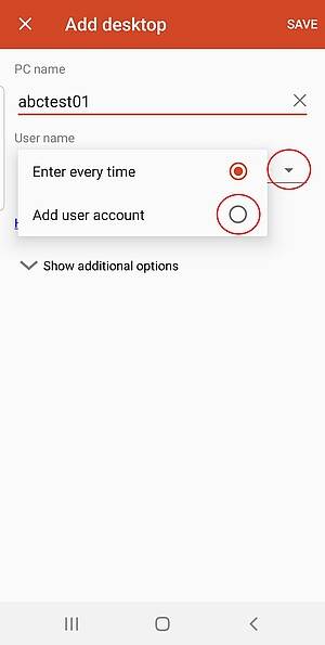 h. Im Textfeld „User name“ auf den Pfeil tippen und „Add user account“ wählen.