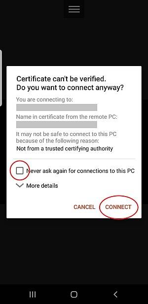 r. Erfolgt eine Zertifikatsabfrage, den Haken bei „Never ask again for connections to this PC“ setzen und die Verbindung über „Connect“ herstellen.