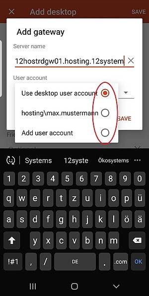 m. Im Textfeld „User account“ rechts auf den Pfeil tippen. Achtung: Entweder das bereits bestehende Benutzerkonto wählen, falls die von der 12systems übermittelten Daten für das Gateway übereinstimmen oder ein neues erstellen, falls die Benutzerdaten abweichen.